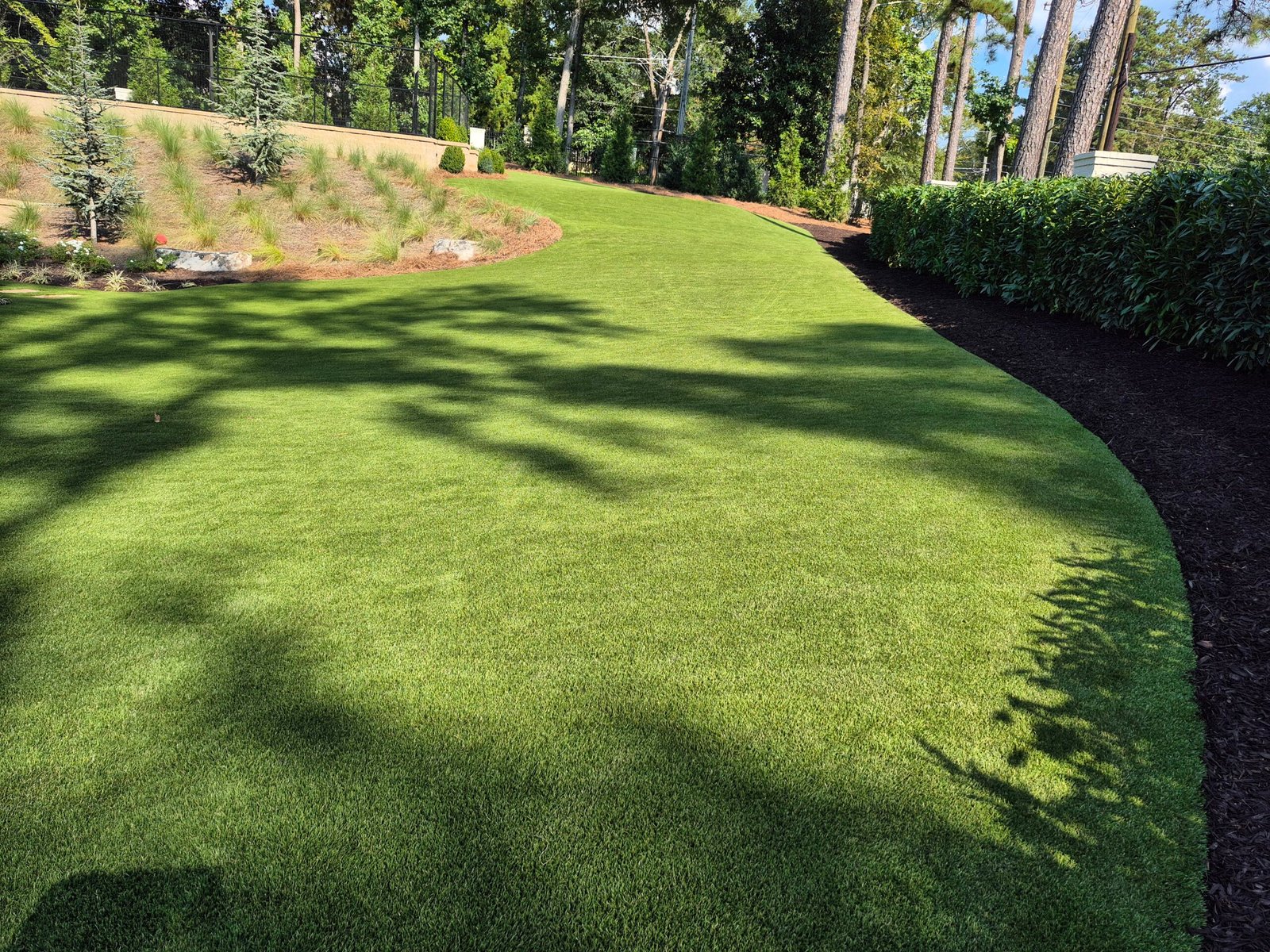 A close-up view of densely packed green blades of artificial grass with varying shades of green and some sunlight creating bright highlights on the synthetic strands.